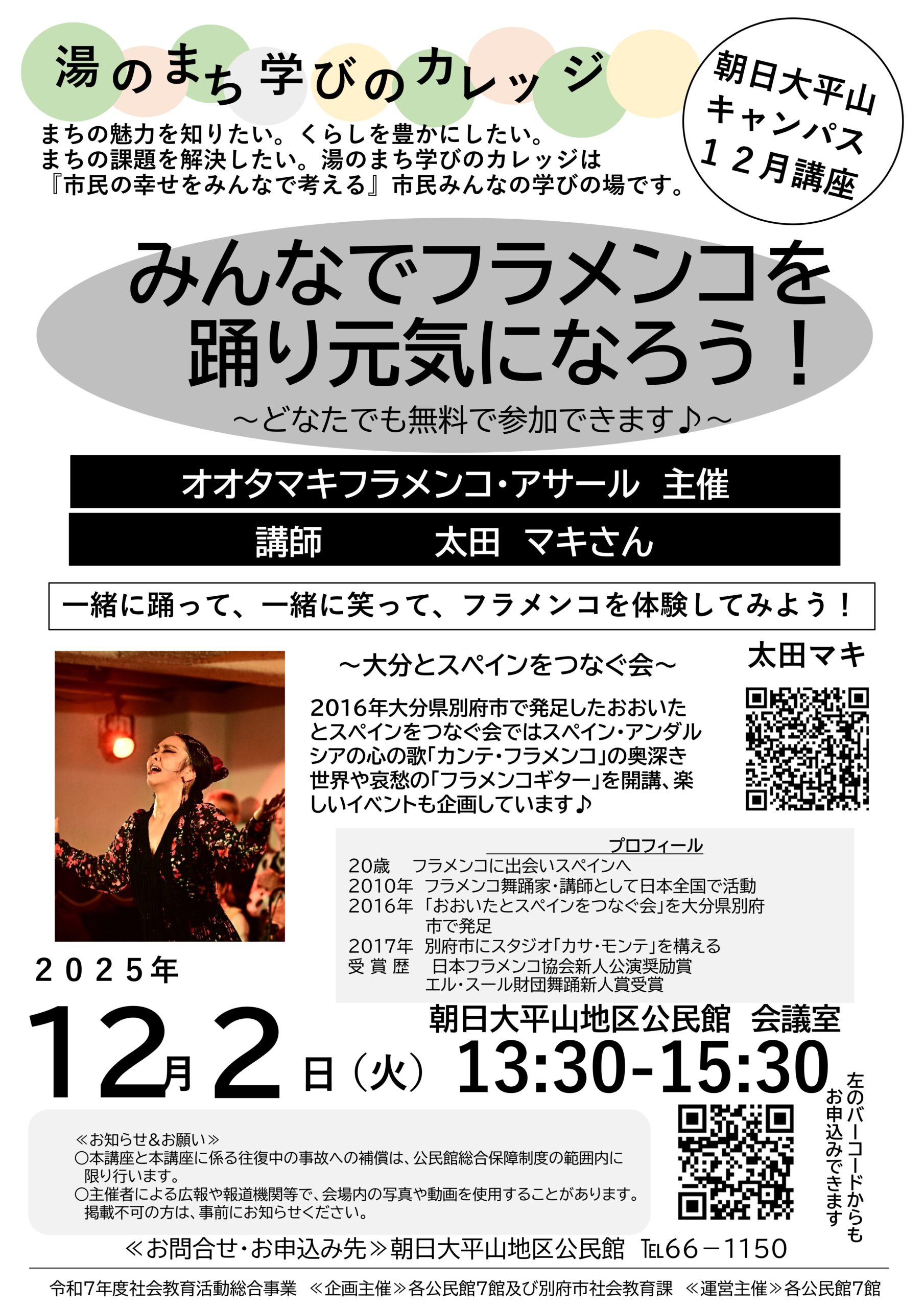2025.11.10 未分類 2025.12.2 湯のまち学びのカレッジ みんなでフラメンコを踊り元気になろう!とのタイトルをつけて頂きましたが、その名の通り、日常にすぐ取り入れられるような姿勢や体の使い方、リズム遊びも取り入れつつ、フラメンコを見て聞いて体験する講座を朝日大平山地区公民館にて開講します。皆様のご参加をお待ちしております。