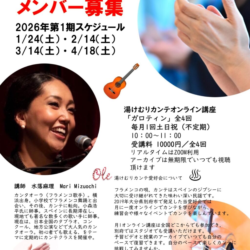 コロナ禍の2020年に発足した湯けむりカンテ愛好会は2年目より日本人カンタオーラ(フラメンコ歌手)水落麻理先生に月1回オンラインでカンテを習っています。